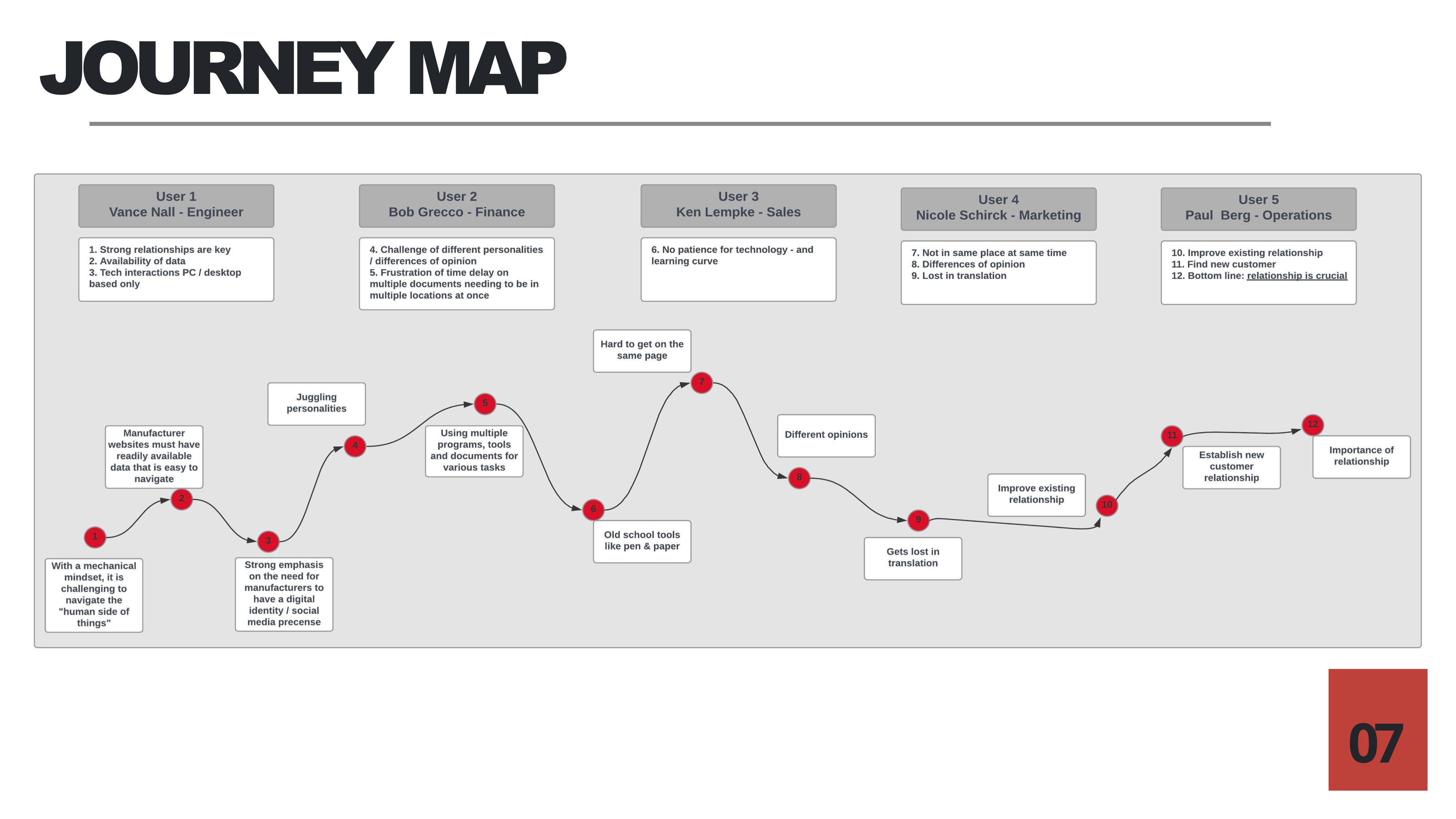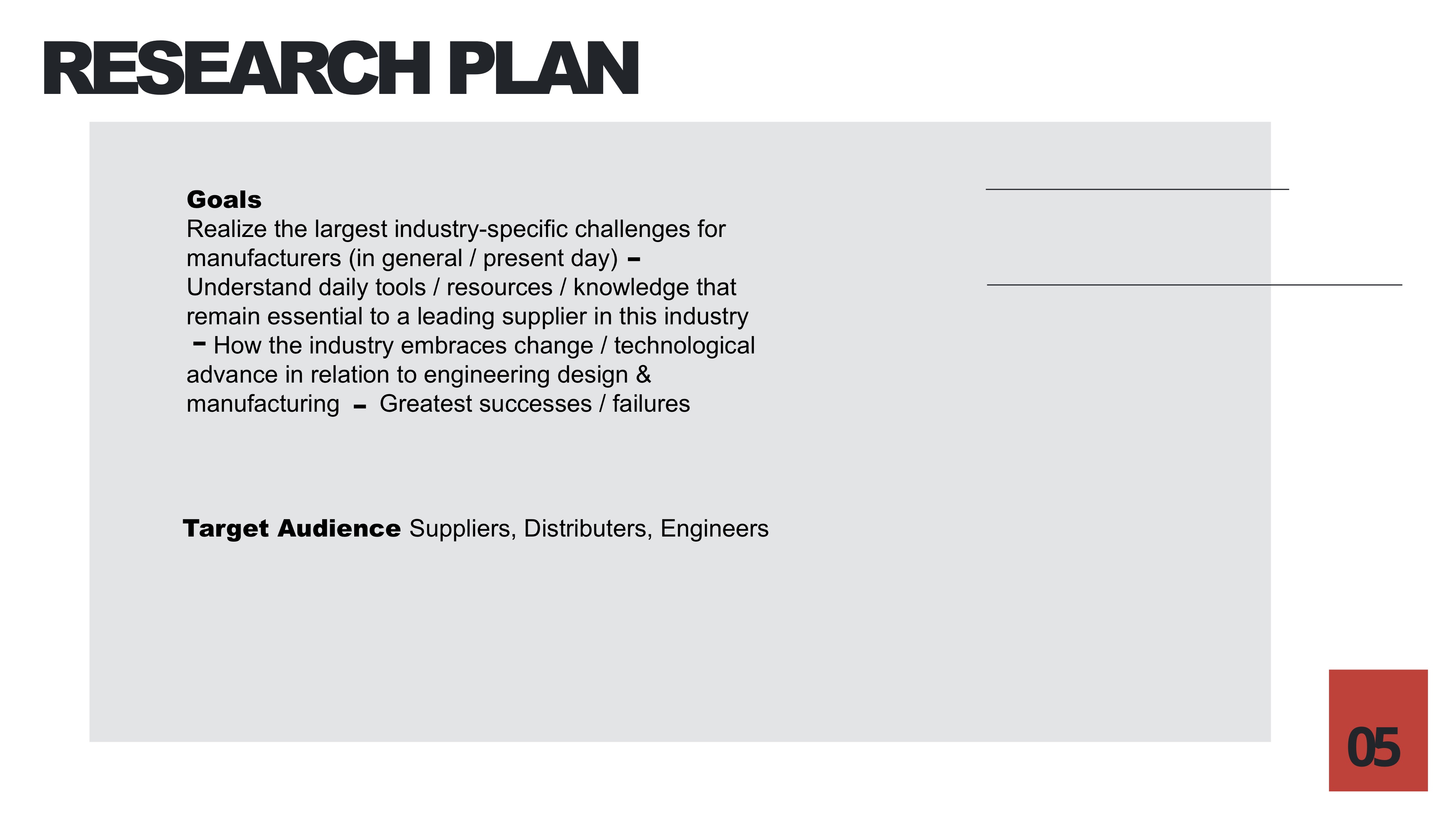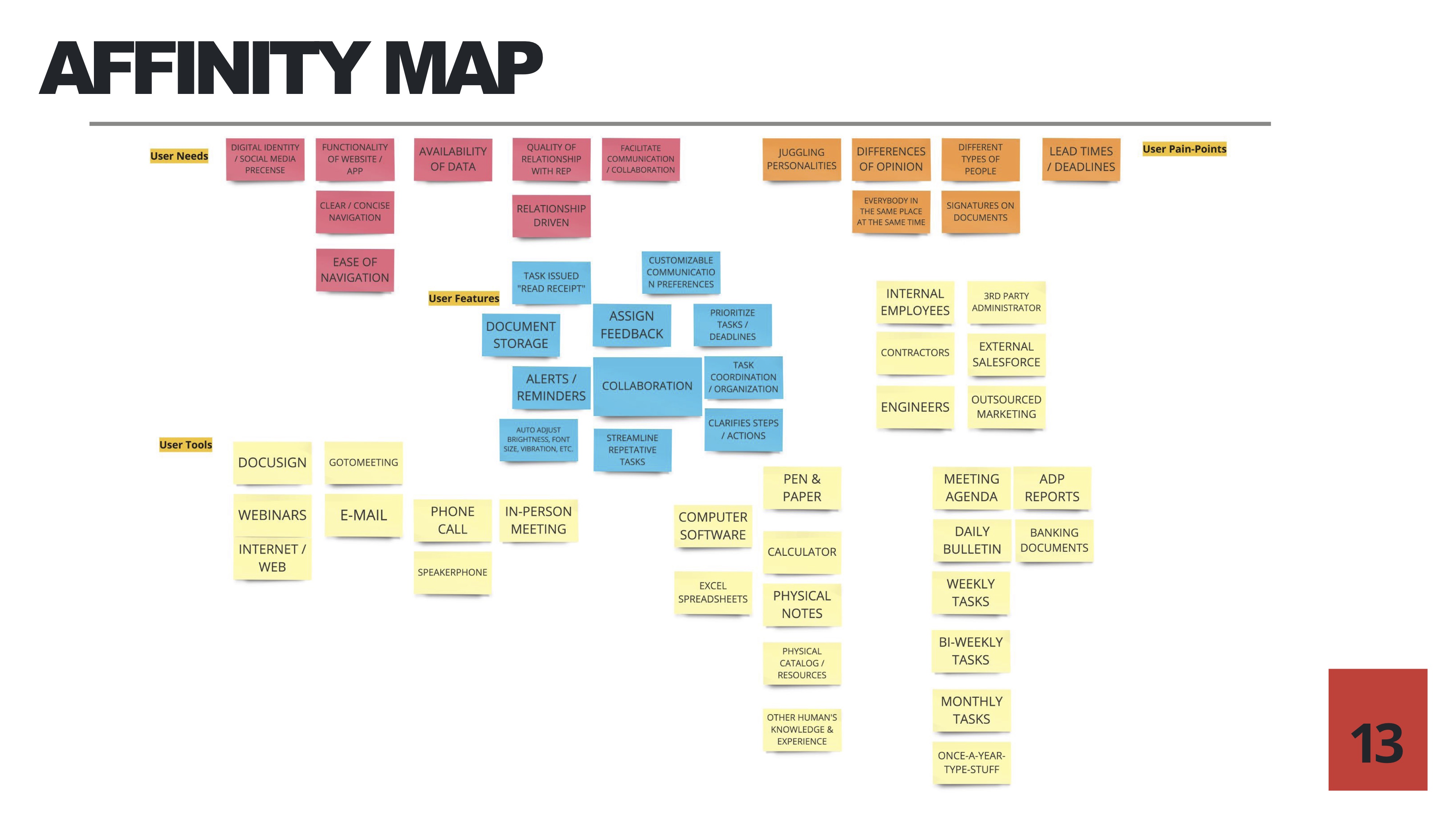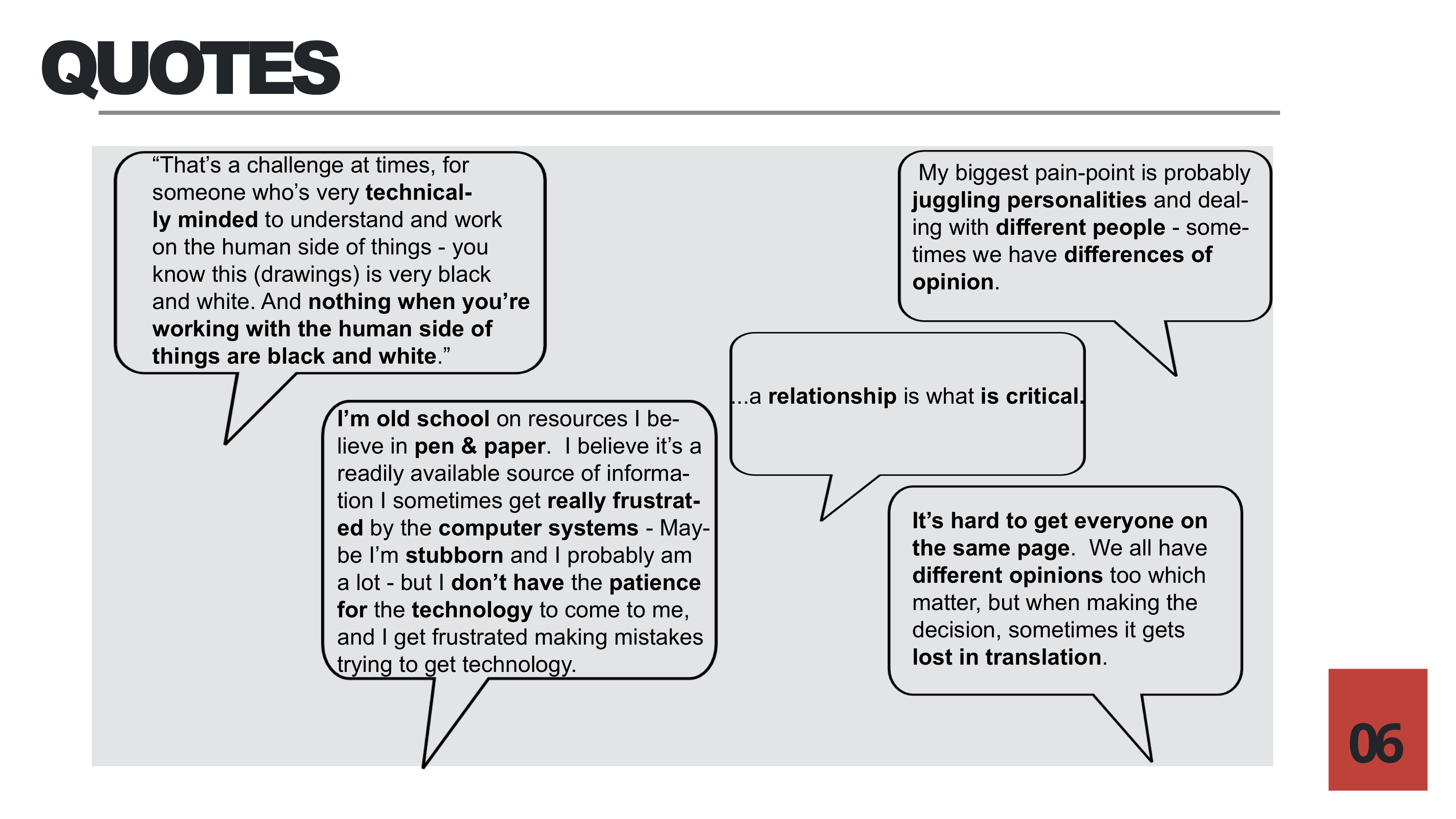 • Conducted interviews with various members of the company and clients to identify daily operational pain-points as they directly related to employees, suppliers, and representatives of the product they manufacture.